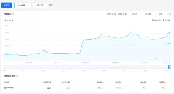 數(shù)據(jù)顯示,多數(shù)消費者更喜愛實木家具。2018年,新浪聯(lián)合居然之家及13家行業(yè)協(xié)會共同發(fā)布的《2018新中產家居消費指數(shù)報告》中顯示,72%的消費者喜愛實木材質,其中一部分更偏愛高檔紅木。從百度指數(shù)來看,近30天內“實木家具”的日均搜索量在兩千左右。春節(jié)后每日搜索量甚至達到三千。